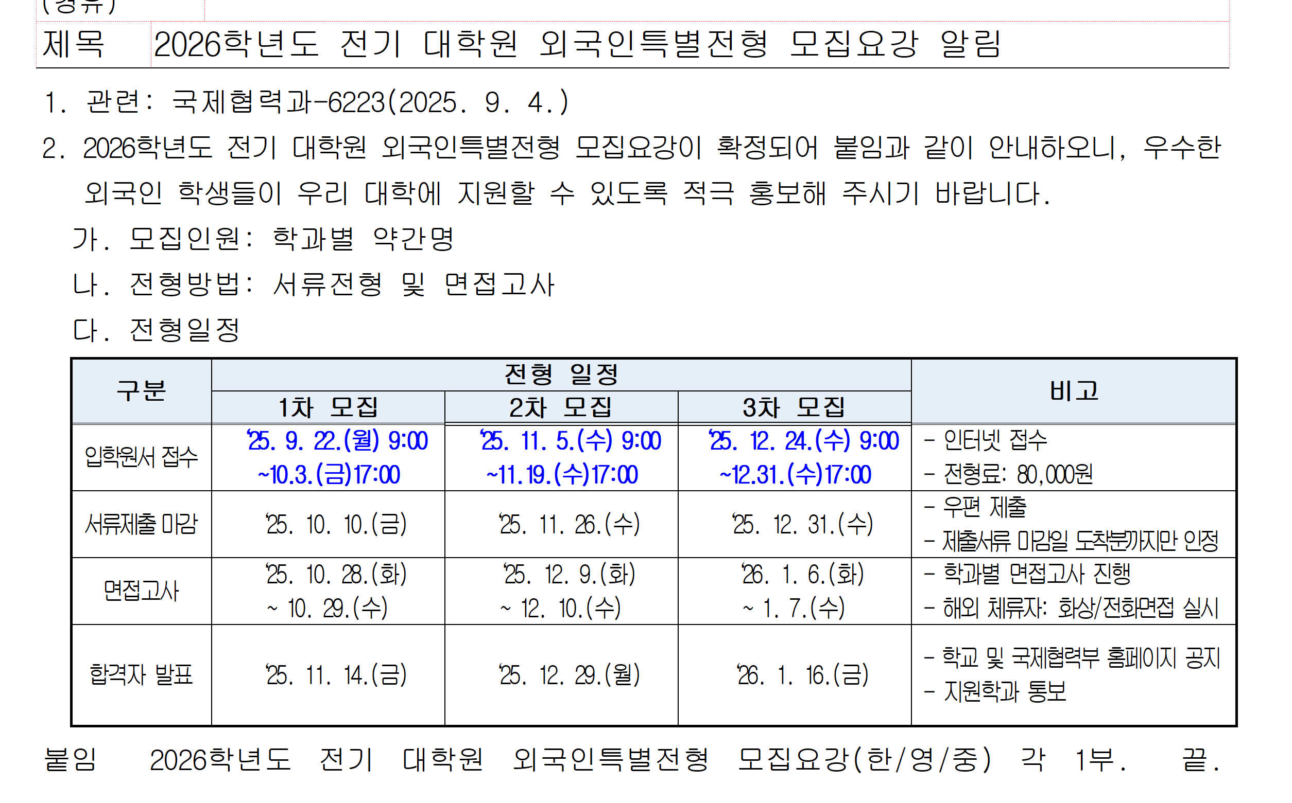 2026학년도 전기 대학원 외국인 특별전형 모집요강을 다음과 같이 공지하오니, 관심 있는 분들의 많은 지원 바랍니다.