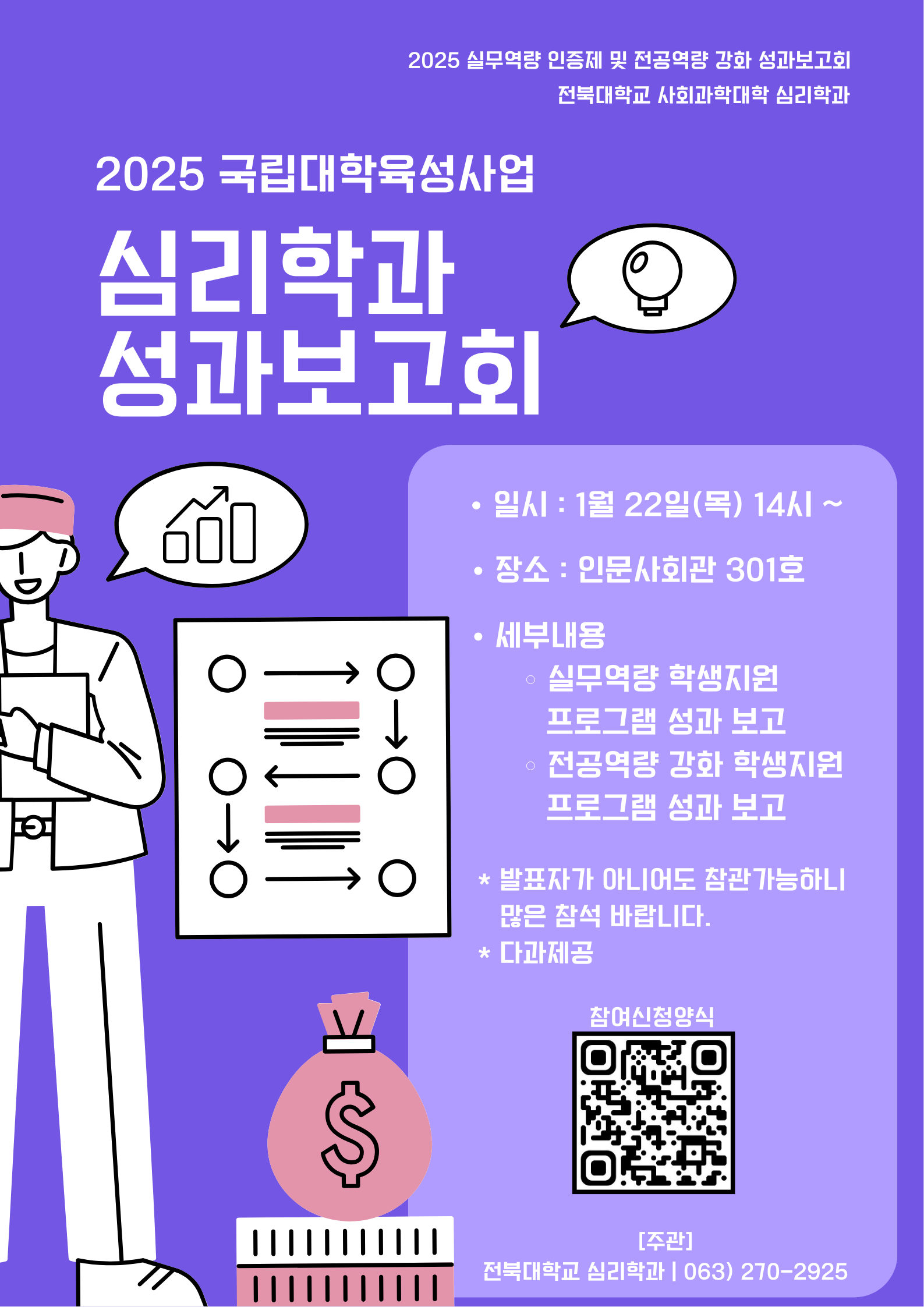 심리학과에서는 2025년동안 학생스터디 및 학부연구생, 학술대회 참가 등으로 지원했던 프로그램의 성과보고회를 다음과 같이 진행합니다. 그동안 프로그램 참여 했던 학생들 및 앞으로 참여를 희망하는 학생들의 많은 참여 바랍니다.