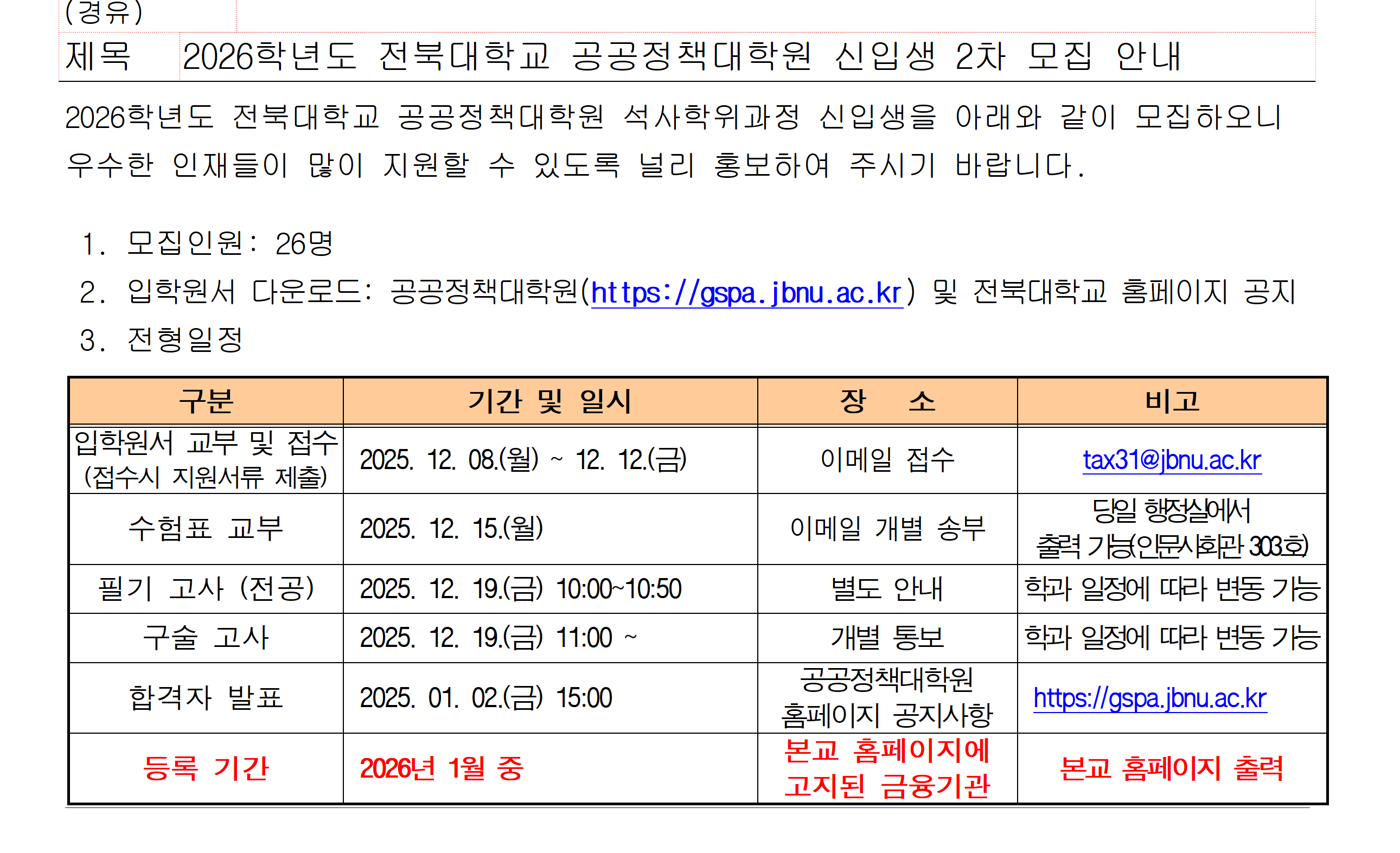 2026학년도 전북대학교 공공정책대학원 신입생 2차 모집 안내